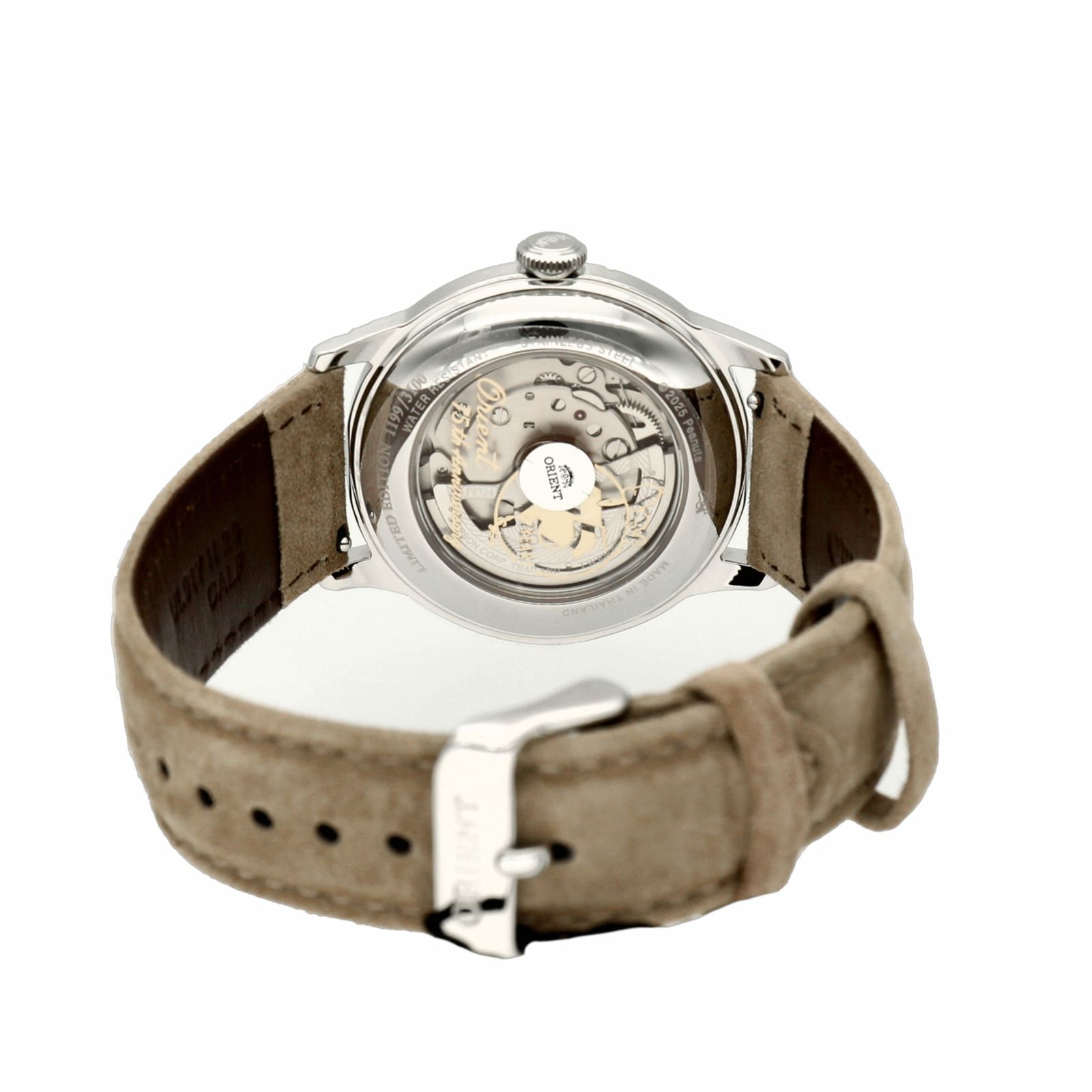 「Orient」75周年と「Peanuts」75周年を記念する特別なモデルです。 12時位置に75周年を記念した筆記体による「Orient」の旧ロゴを配しております。 6時位置には定番の寝そべりポーズのスヌーピーとオリエントの向い獅子マークを想起させる王冠を被ったウッドストックを組み合わせたオリジナルデザインの特別感がある1本です。 ☆限定3,100本(国内200本・海外2,900本)の本数限定です。