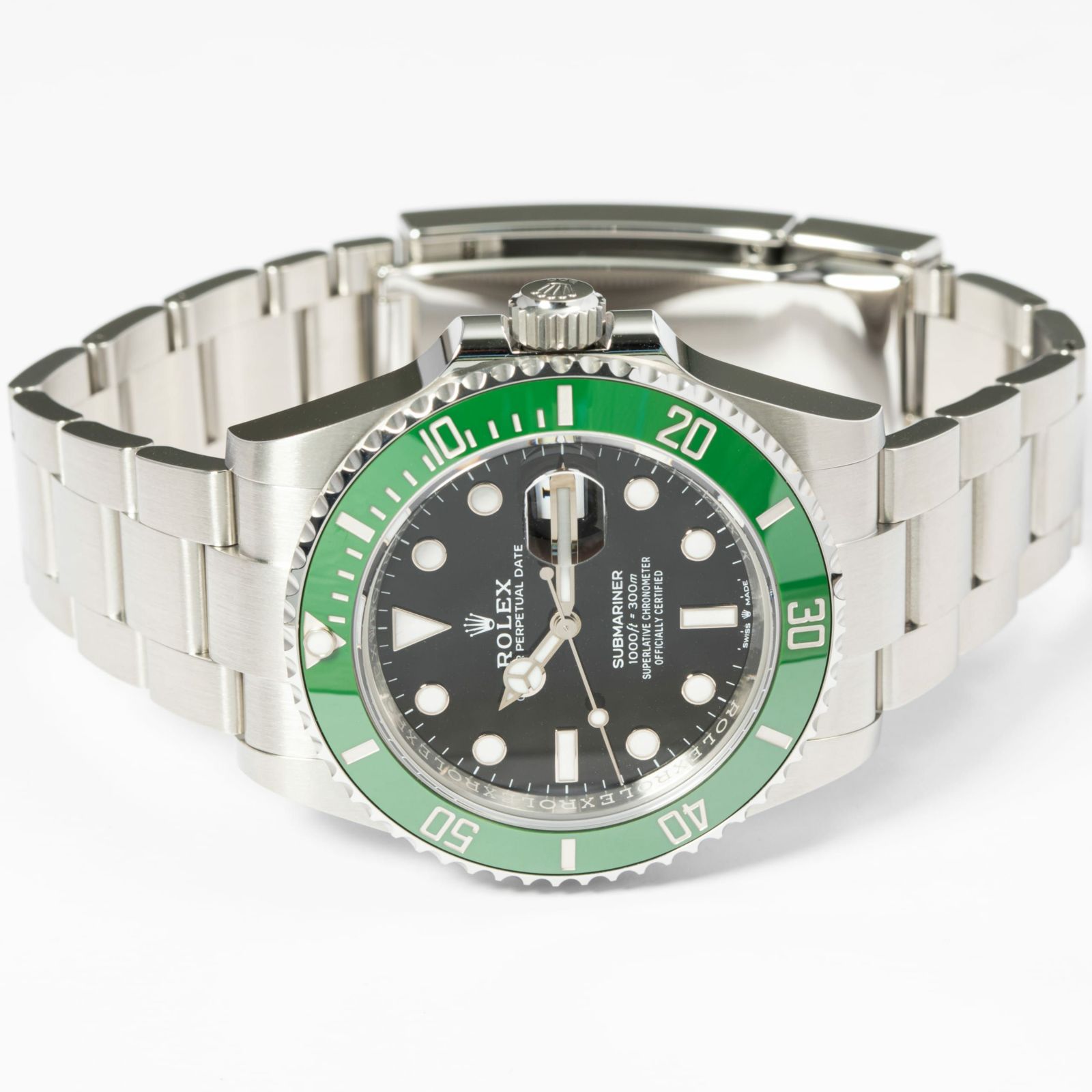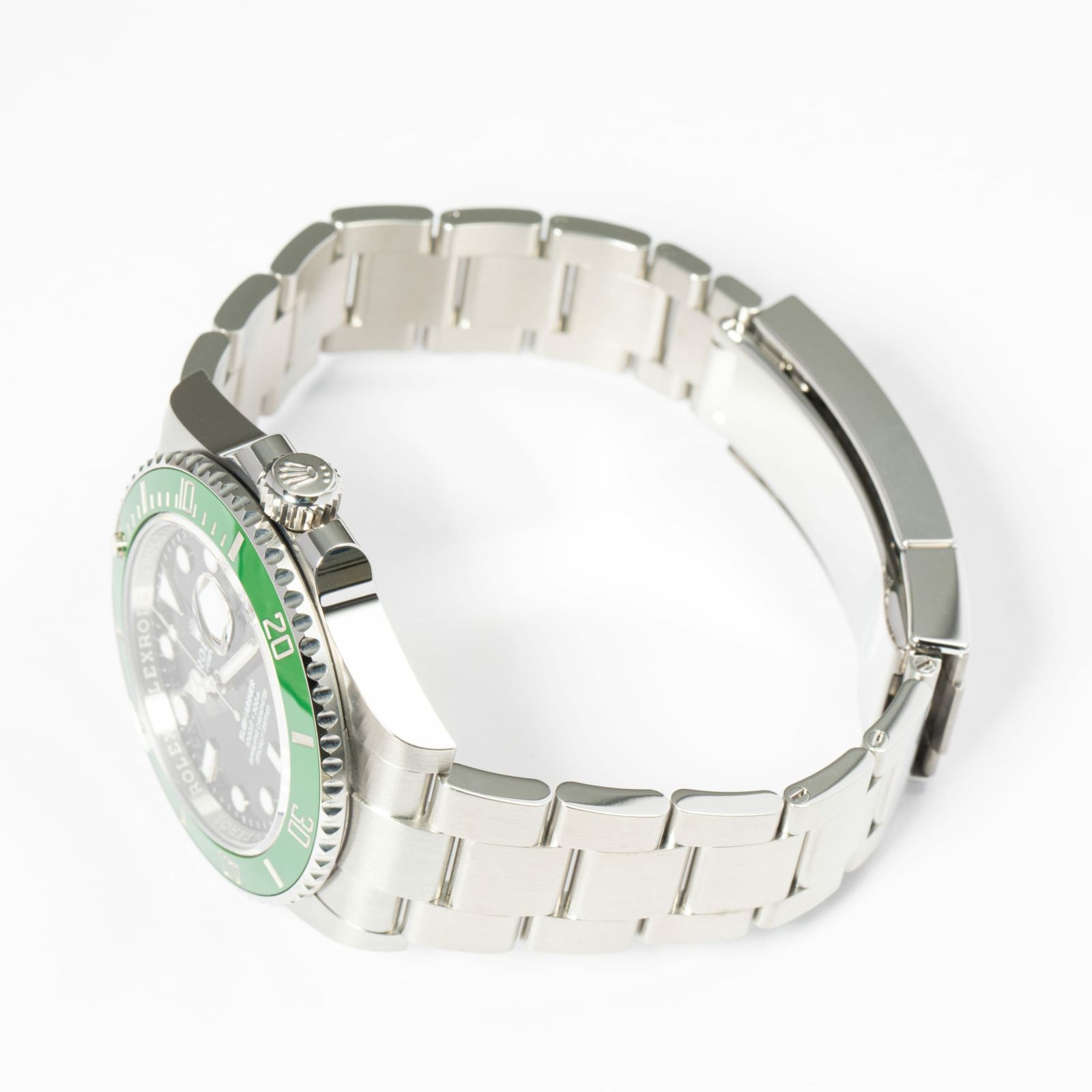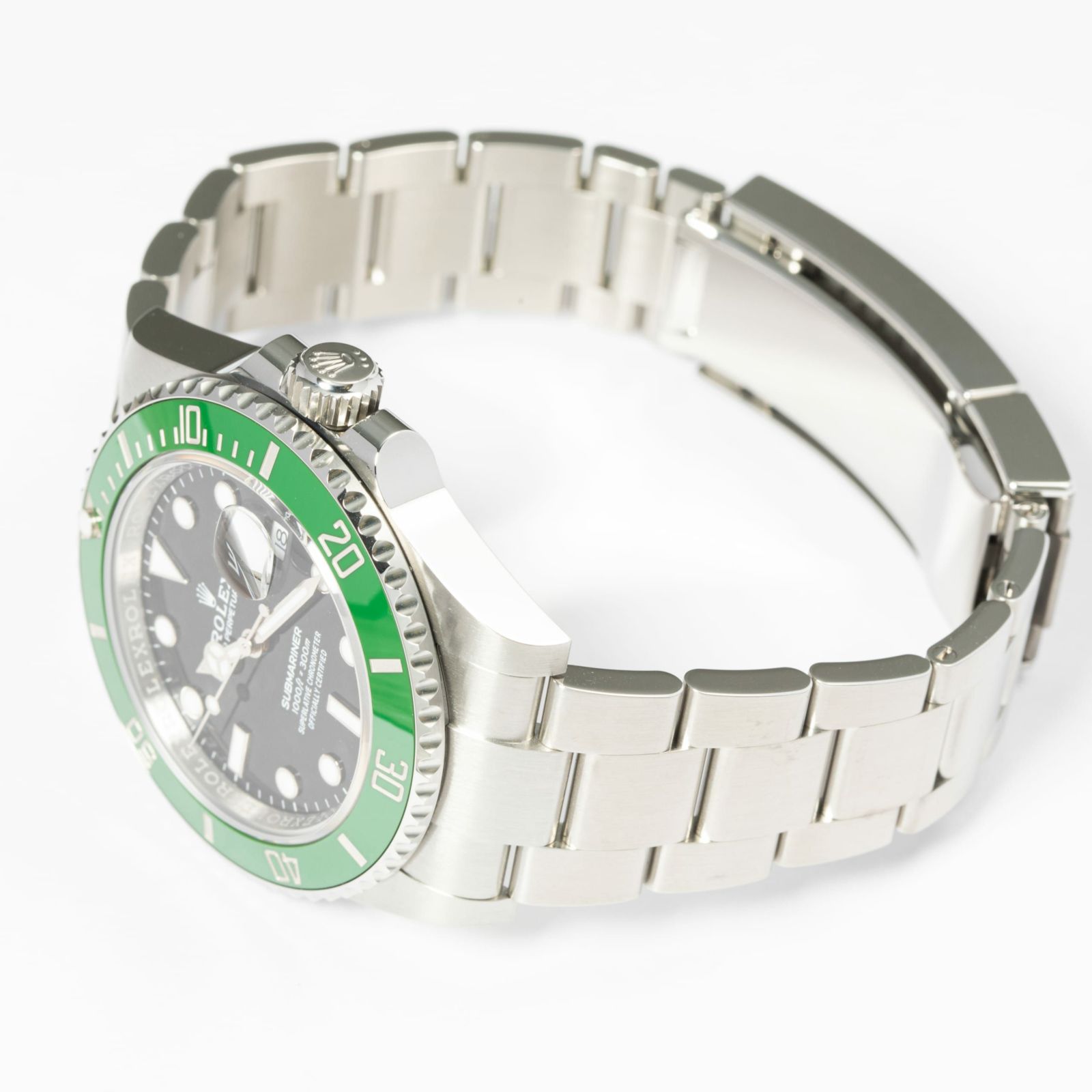 1953年からスタートしたサブマリーナーはダイバーズウォッチの原点とも言われています。「潜水艦乗務員」という意味を持ち現在は300m防水と機能性にもすぐれています。サブマリーナー生誕50周年を記念して発表されたグリーンサブマリーナー。 2020年に発表された今作が3代目となり、当モデルはケース径が前作より1mmアップした41mmサイズでラグ幅などが細くなったことによりバランスの良いサイズ感で腕元に落ち着きを見せます。特徴的なグリーンベゼルには傷に強いセラクロムベゼルを採用し、暗闇でも視認性の良いクロマライト夜光塗料を使用しています。 ブレスレットは堅牢性の高いマットな3連ブレスでグライドロック・エクステンションブレスは容易にサイズの変更が可能な仕様となっています。 型番のLVとはフランス語でLunette Vert「緑のベゼル」という意味を持ちます。 通称名は「スターバックス」と言われています。