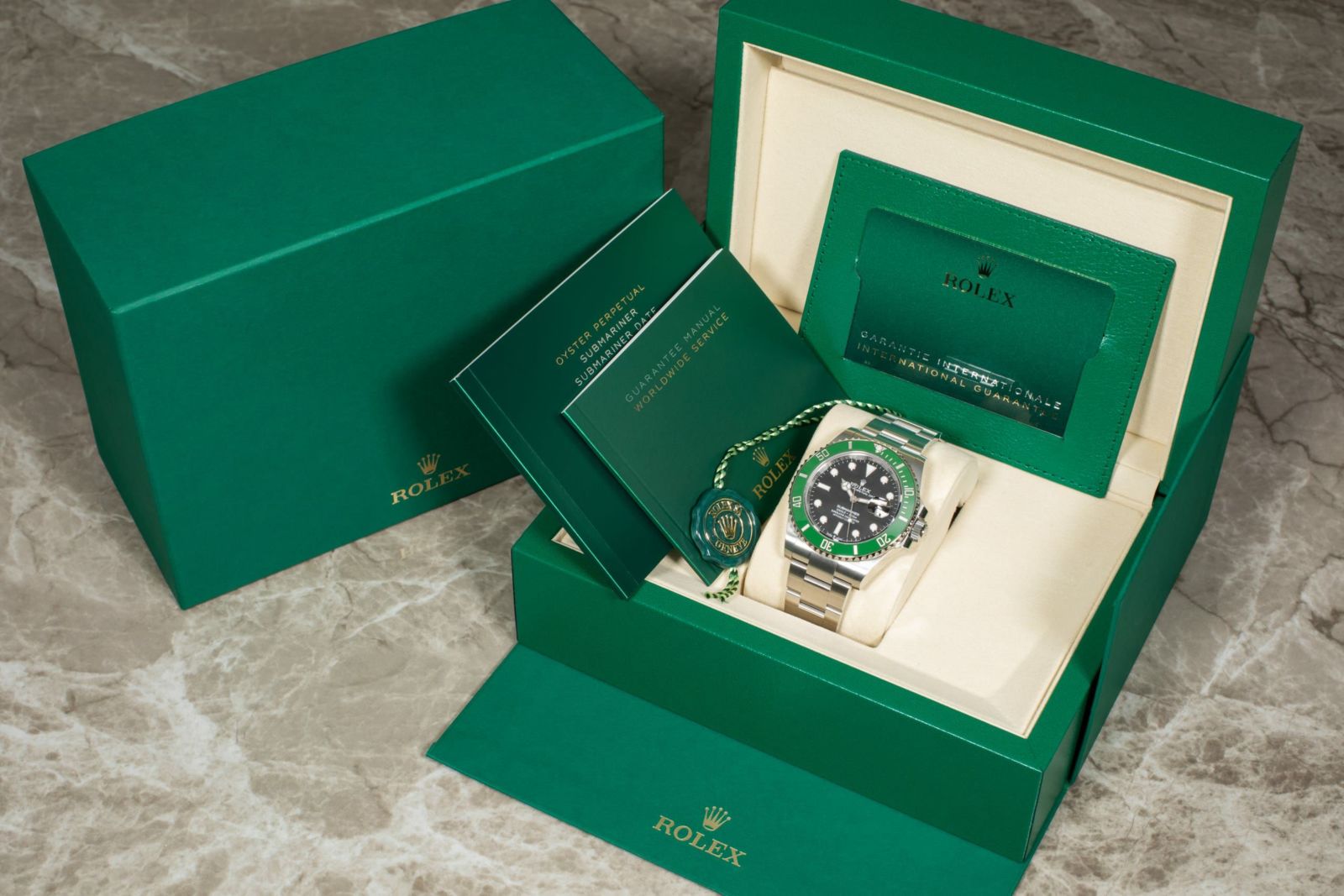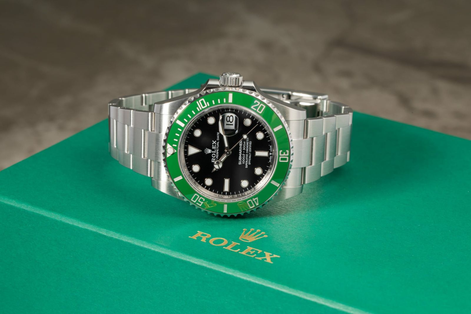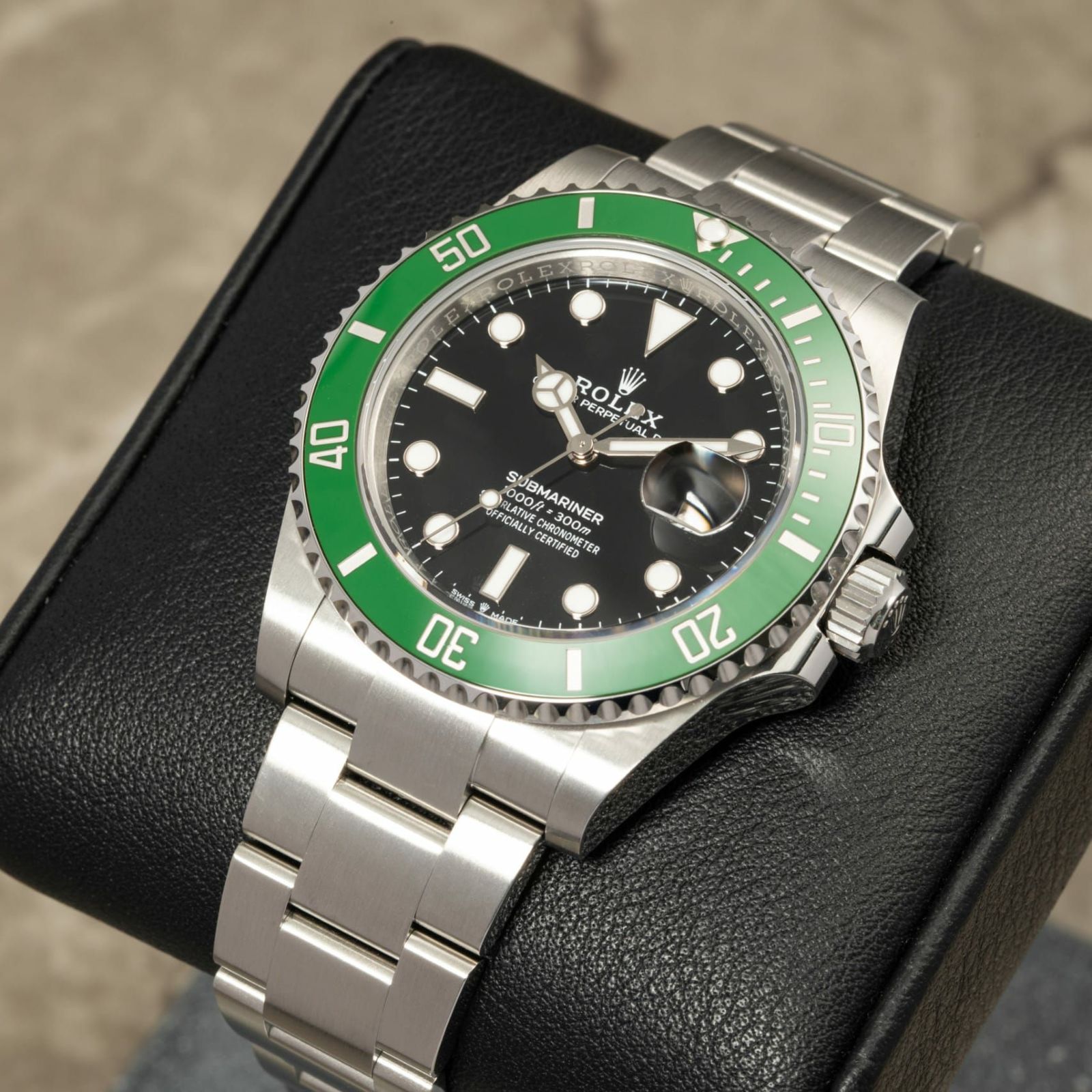 1953年からスタートしたサブマリーナーはダイバーズウォッチの原点とも言われています。「潜水艦乗務員」という意味を持ち現在は300m防水と機能性にもすぐれています。サブマリーナー生誕50周年を記念して発表されたグリーンサブマリーナー。 2020年に発表された今作が3代目となり、当モデルはケース径が前作より1mmアップした41mmサイズでラグ幅などが細くなったことによりバランスの良いサイズ感で腕元に落ち着きを見せます。特徴的なグリーンベゼルには傷に強いセラクロムベゼルを採用し、暗闇でも視認性の良いクロマライト夜光塗料を使用しています。 ブレスレットは堅牢性の高いマットな3連ブレスでグライドロック・エクステンションブレスは容易にサイズの変更が可能な仕様となっています。 型番のLVとはフランス語でLunette Vert「緑のベゼル」という意味を持ちます。 通称名は「スターバックス」と言われています。
