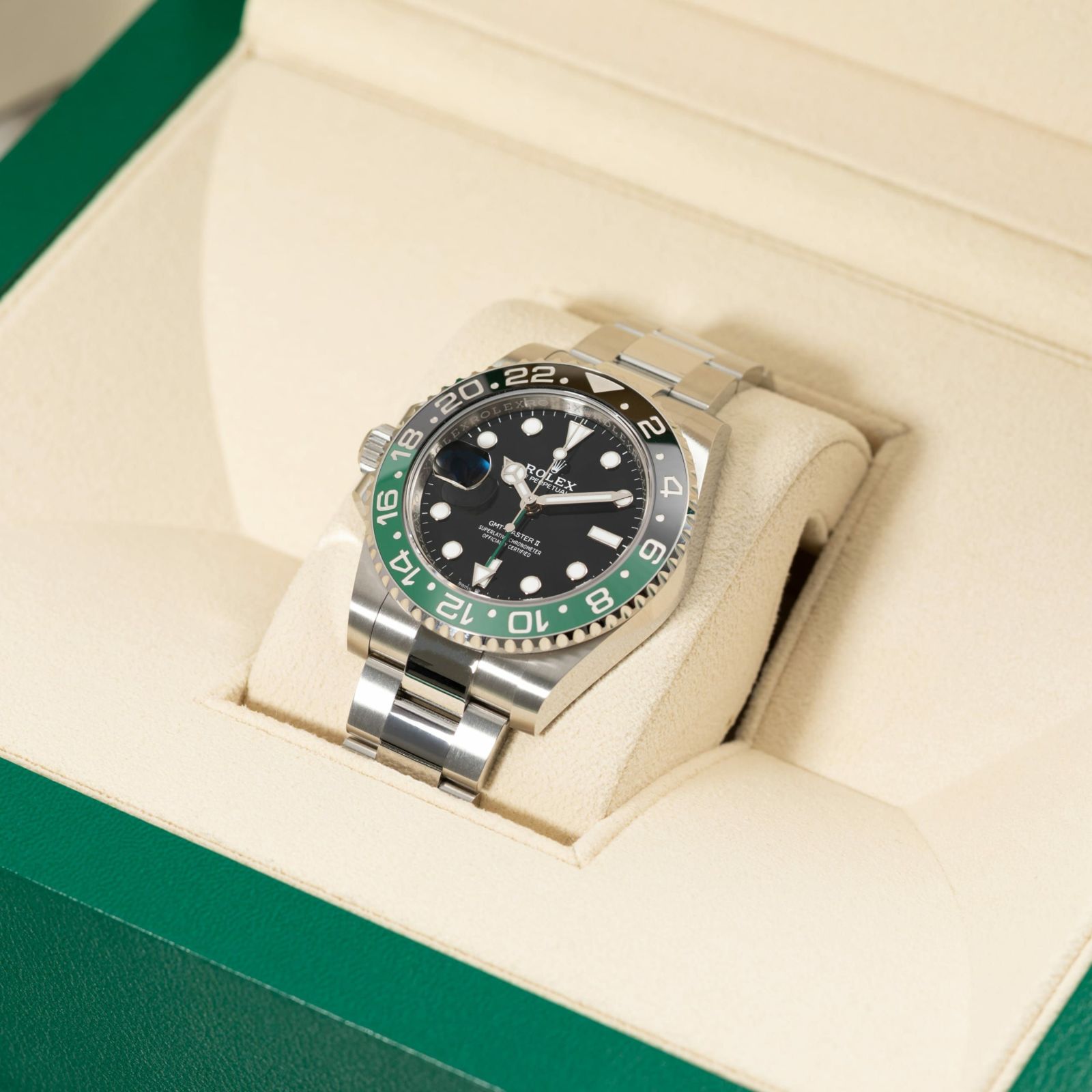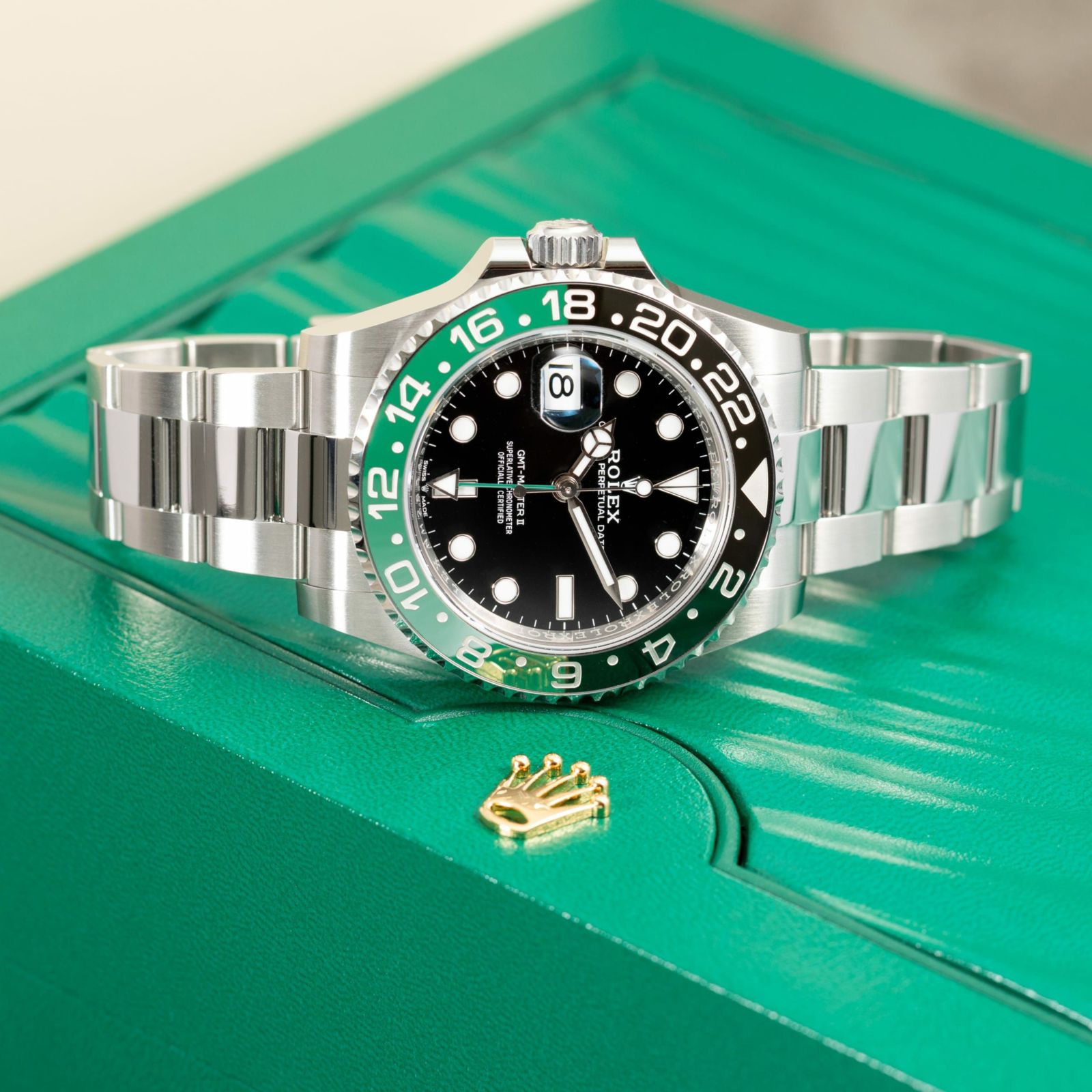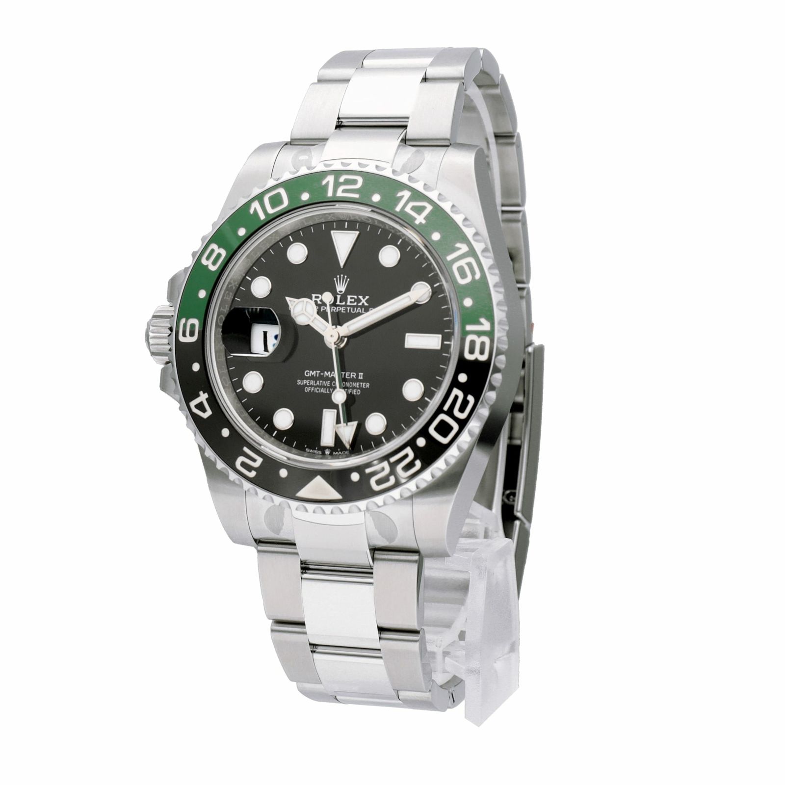 2022年の新作「126720VTNR GMTマスターII」の特徴は、レフティ用に制作された左リューズ。右利きの方が左手に装着しても手に当たることはほとんど無く、リューズ操作も簡単に行えます。さらにベゼルはグリーンとブラックになり、コーポレートカラーをベゼルとGMT針に取り入れた珍しさも話題となりました。 単独で動く短針とGMT針、両回転式のベゼルを操作することで第3か国までの時刻を表示することが出来ます。クロノメーター認定の自社ムーブメント3285搭載、パワーリザーブ約70時間、100m防水仕様になります。 ブレスレットの長さを約5 mm延長させることができ、あらゆる場面でより快適な装着感が実現できます。