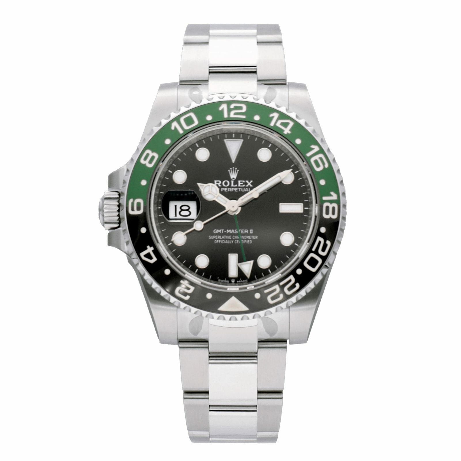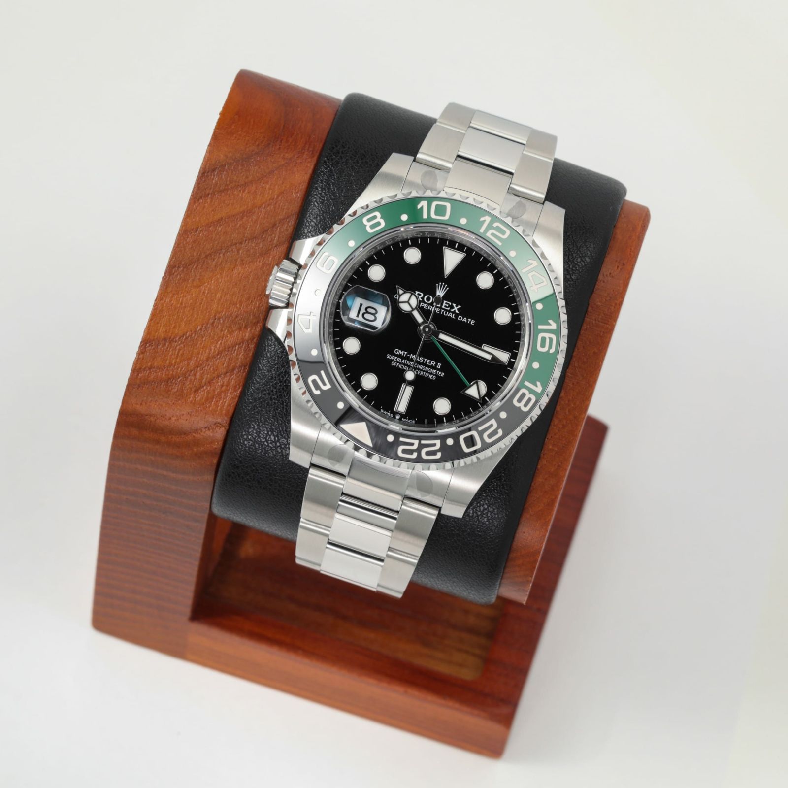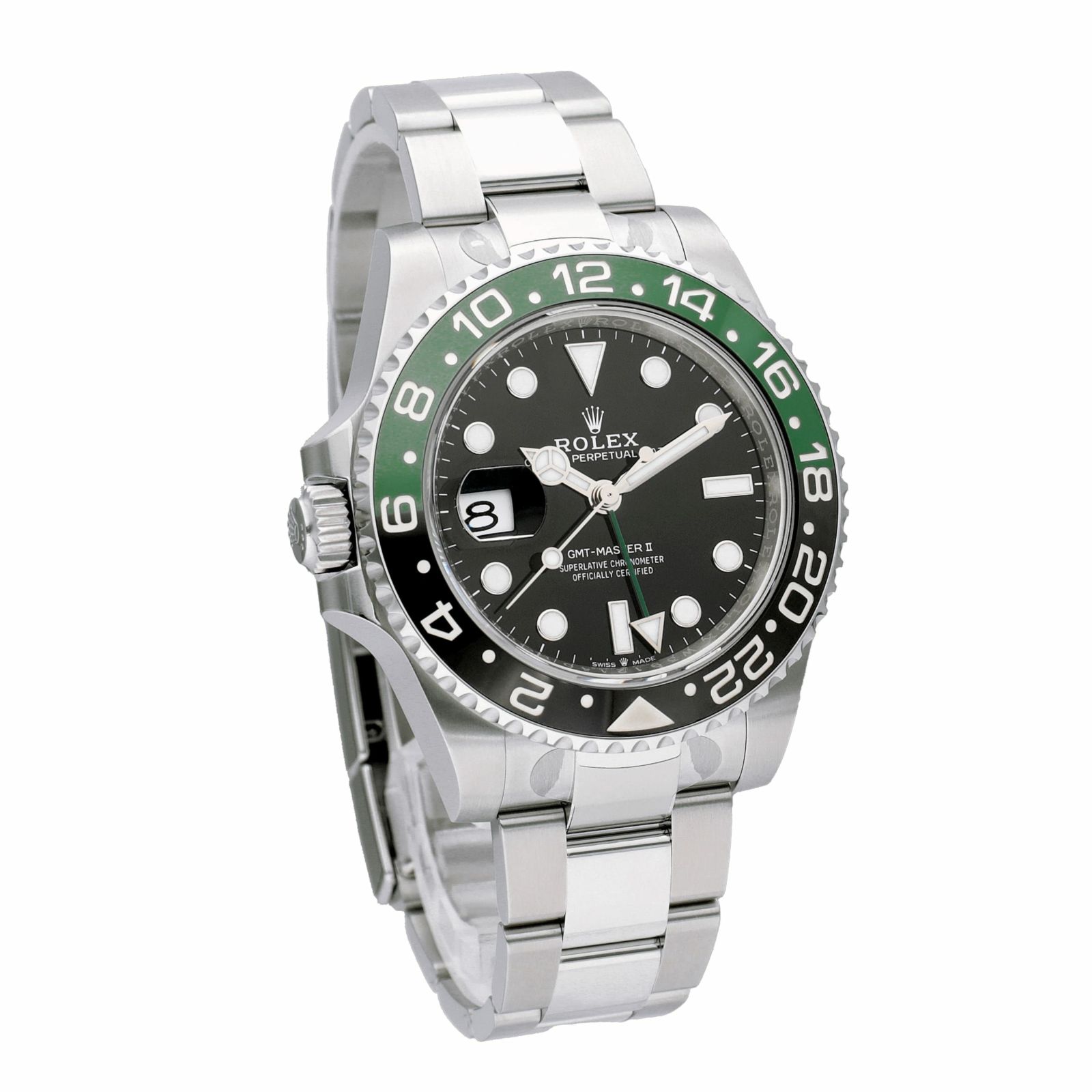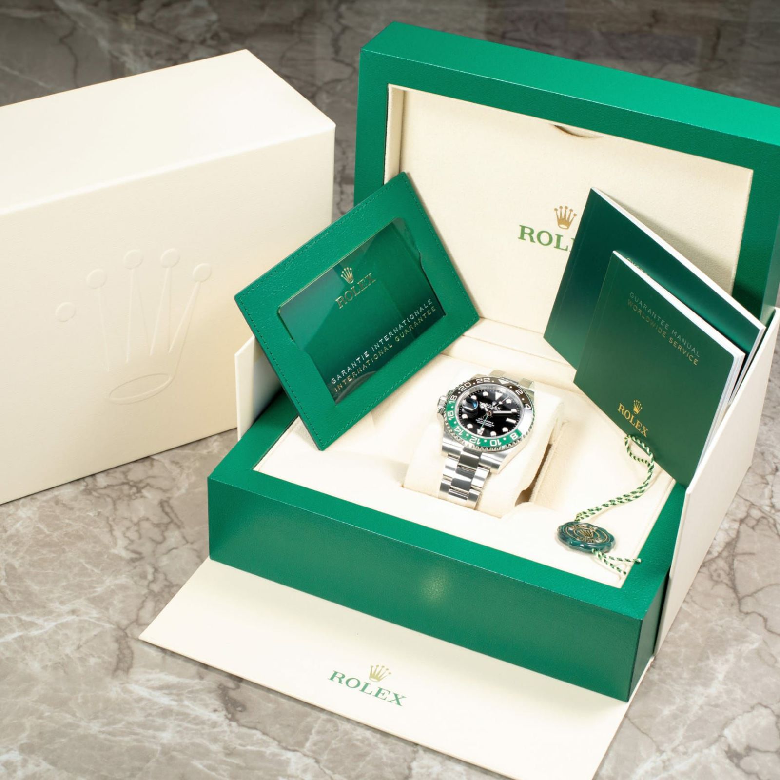 2022年の新作「126720VTNR GMTマスターII」の特徴は、レフティ用に制作された左リューズ。右利きの方が左手に装着しても手に当たることはほとんど無く、リューズ操作も簡単に行えます。さらにベゼルはグリーンとブラックになり、コーポレートカラーをベゼルとGMT針に取り入れた珍しさも話題となりました。 単独で動く短針とGMT針、両回転式のベゼルを操作することで第3か国までの時刻を表示することが出来ます。クロノメーター認定の自社ムーブメント3285搭載、パワーリザーブ約70時間、100m防水仕様になります。 ブレスレットの長さを約5 mm延長させることができ、あらゆる場面でより快適な装着感が実現できます。