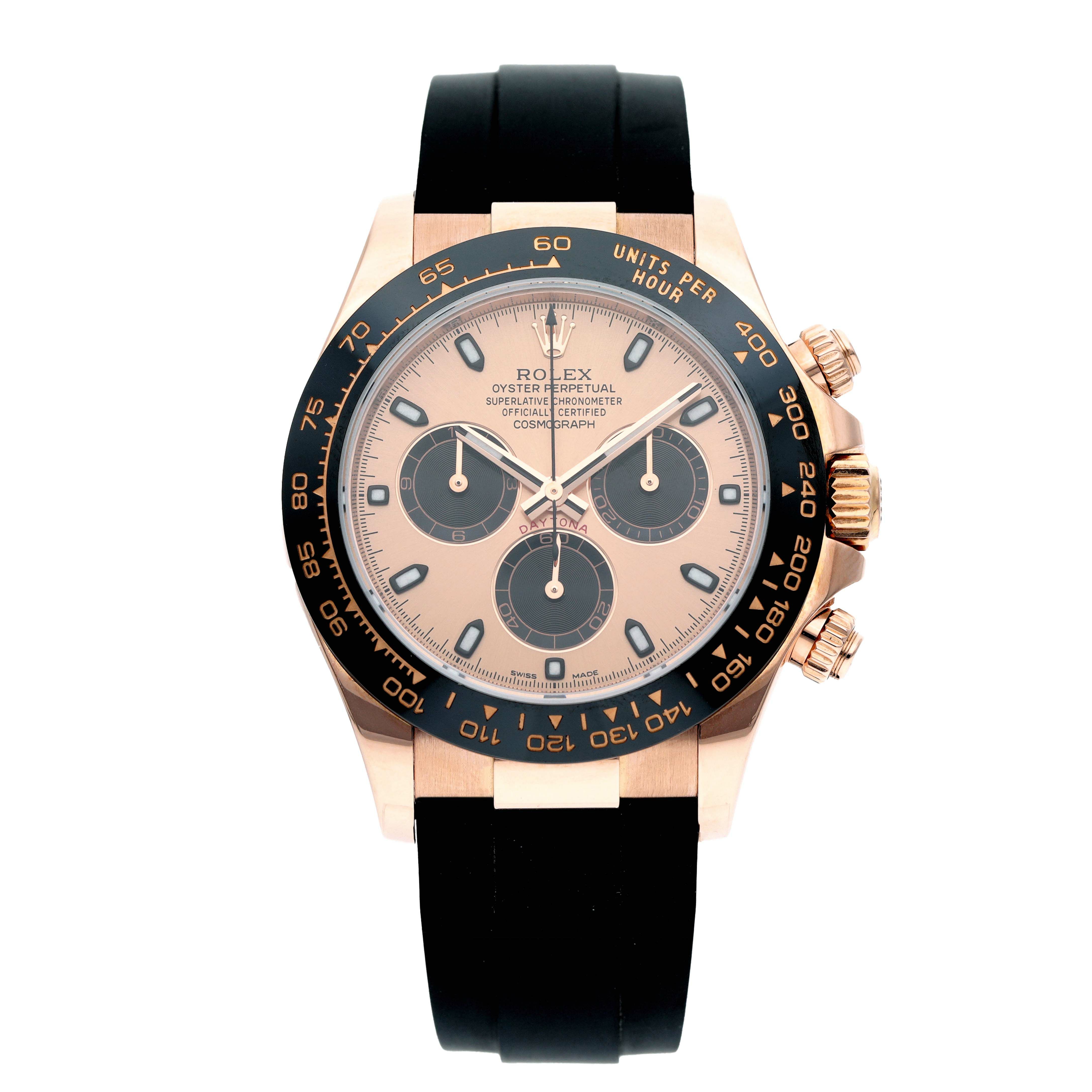 エバーローズゴールドの華やかさに、ブラックのセラクロムベゼルとオイスターフレックスブレスのスポーティさを組み合わせた、非常に完成度の高い一本です。ゴールドモデルでありながら重たく見えすぎず、黒が全体を引き締めてくれるので、ラグジュアリーなのに大人っぽくまとまるのが魅力。腕に乗せた瞬間に、デイトナらしい特別感と実用性のバランスの良さがしっかり伝わるモデルです。