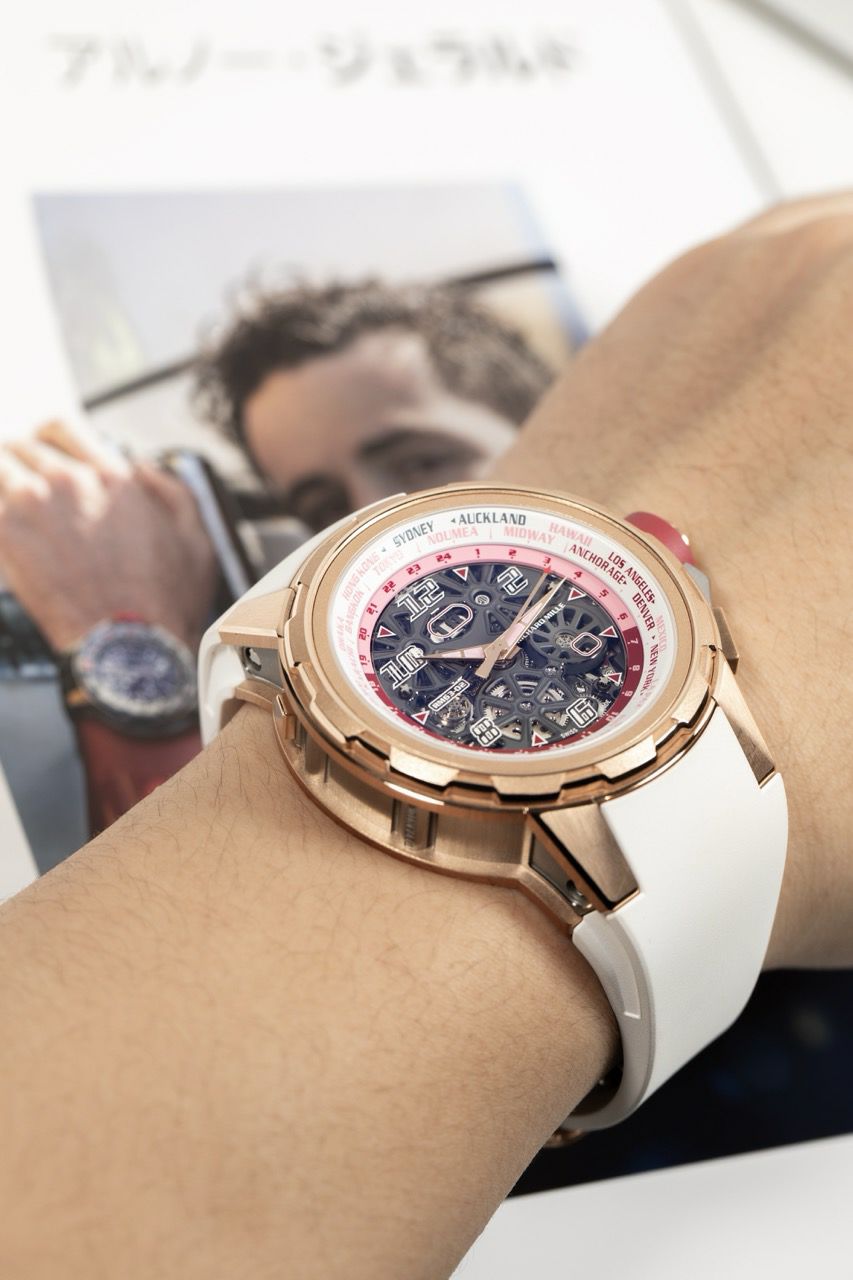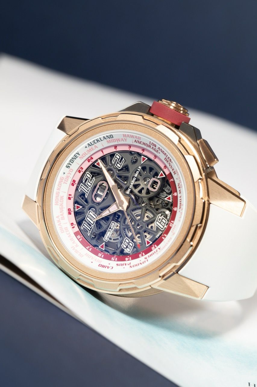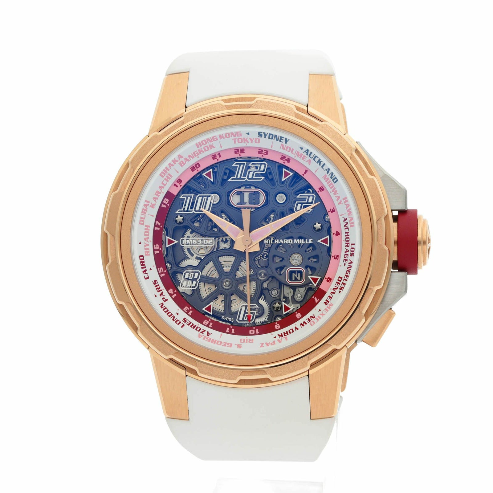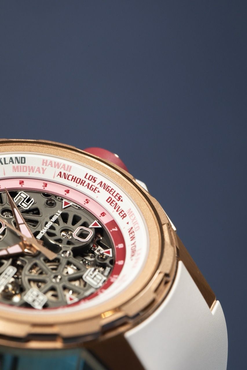 複雑なワールドタイム機構を“リシャールミルらしく直感的に使える”形に落とし込んだ、個性の強いトラベルウォッチです。最大の特徴は、都市を切り替えるための回転ベゼル連動のワールドタイマー機構で、一般的な多機能時計よりも操作感がわかりやすく、見た目のインパクトもしっかりあります。自動巻きムーブメントで、時・分・ビッグデイト・24時間表示を備えた実用性の高い構成なのも魅力です。