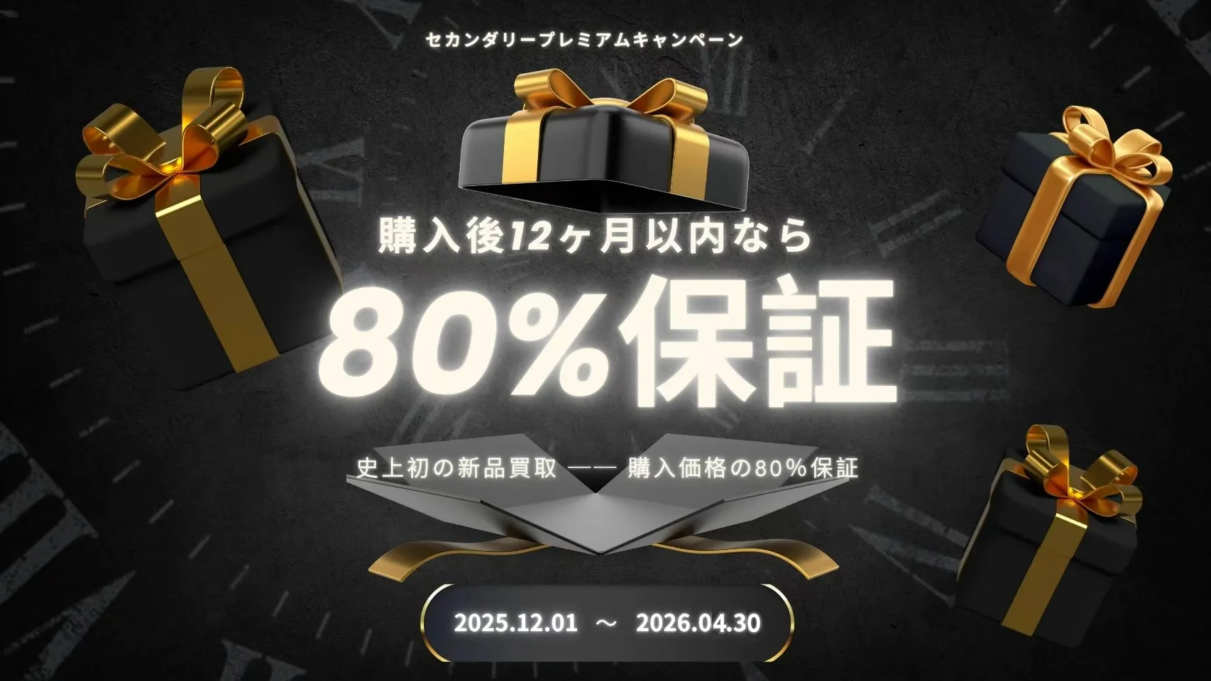 ご購入日から1年以内であれば、購入時の税込価格の80%での買取をお約束する特別保証サービスです。